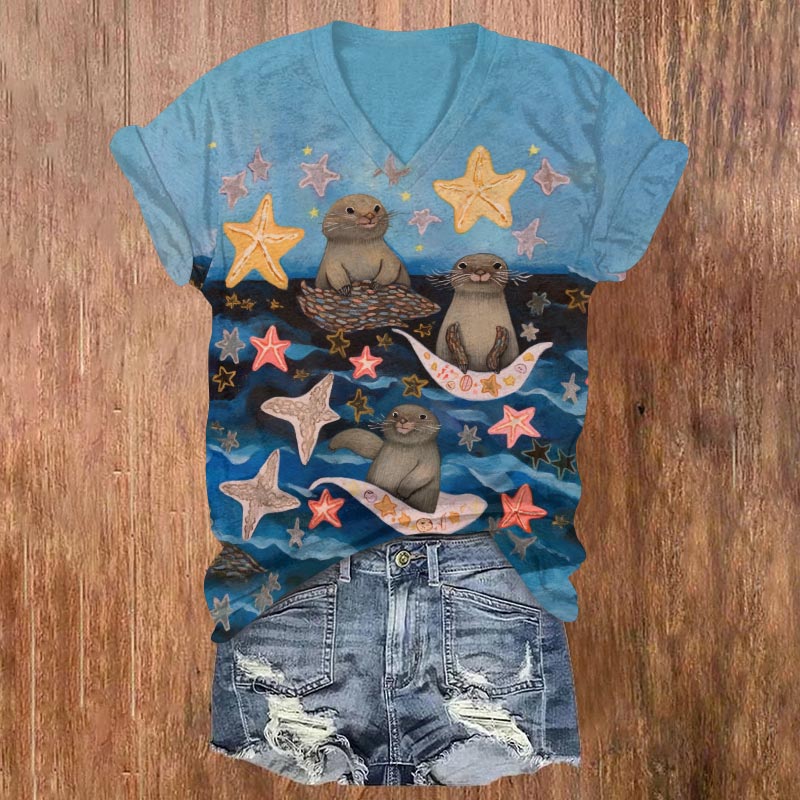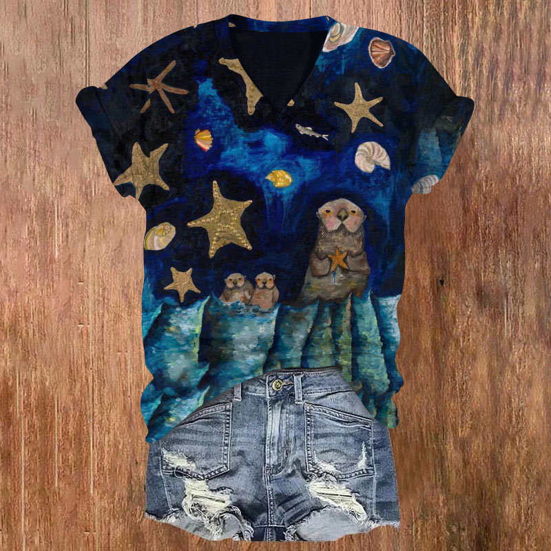 Dashingsoul Cute Starfish And Sea Otter Ombre Print V-neck T-shirt