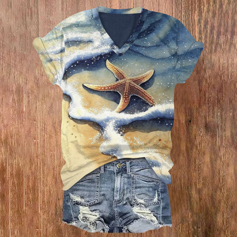Dashingsoul Beach Starfish Print V-neck T-shirt