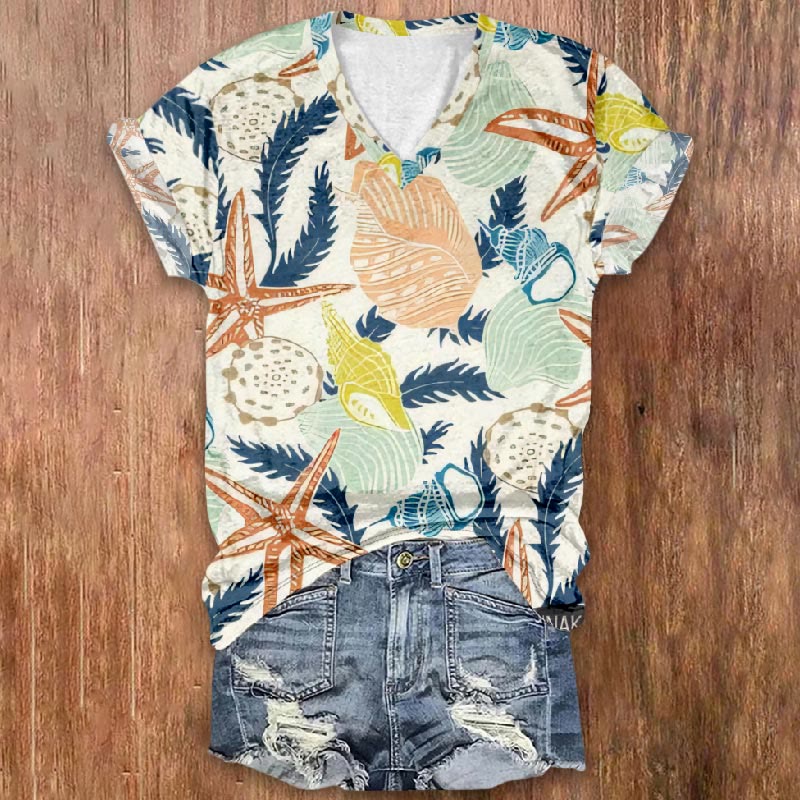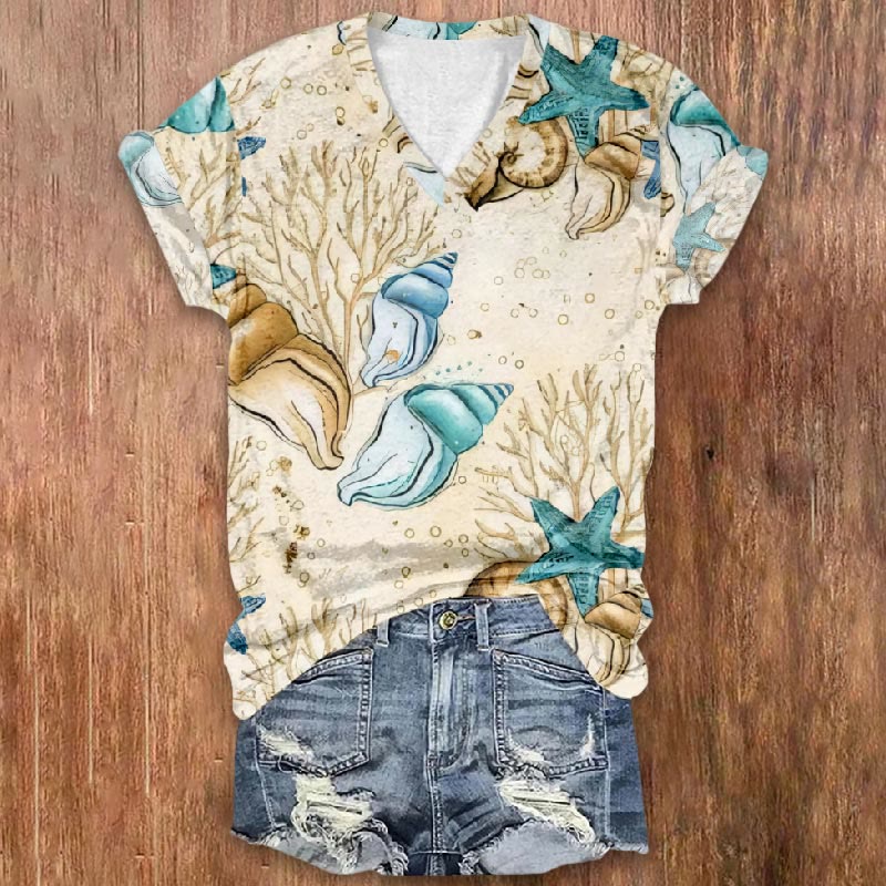 Dashingsoul Colorful Conch With Blue Starfish Print V-neck Short Sleeve T-shirt