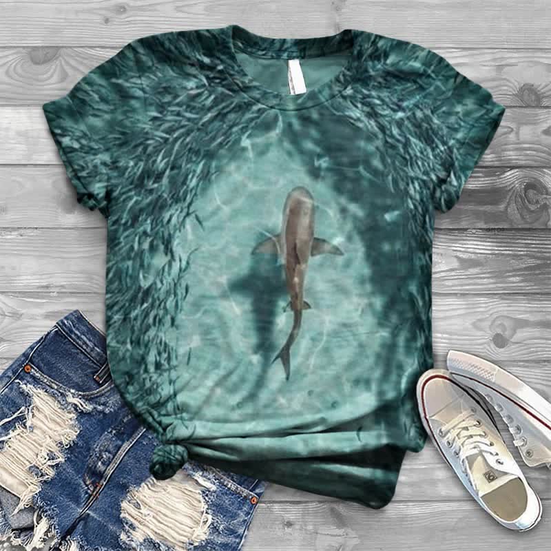 Dashingsoul Shark Swimming Among Sardines Print T-shirt