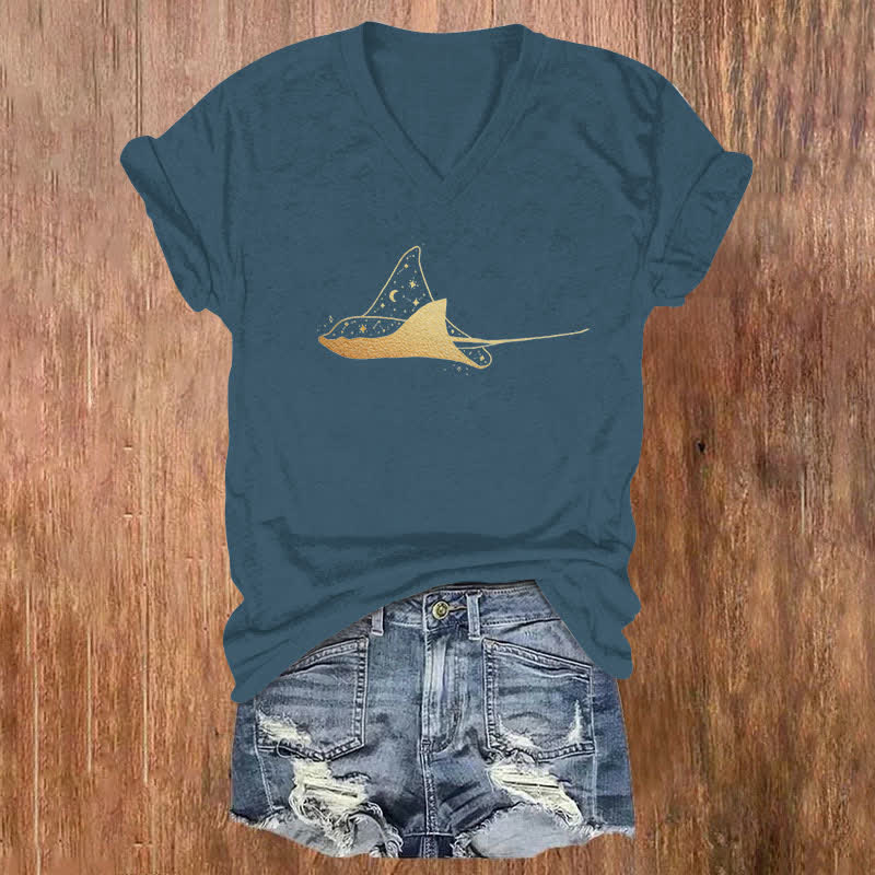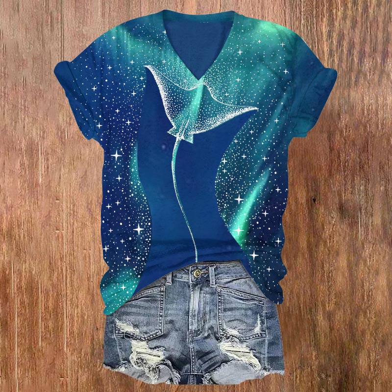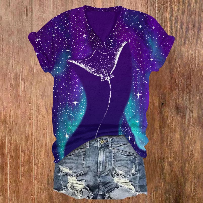Starry Spotted Eagle Rays Print V-neck T-shirt