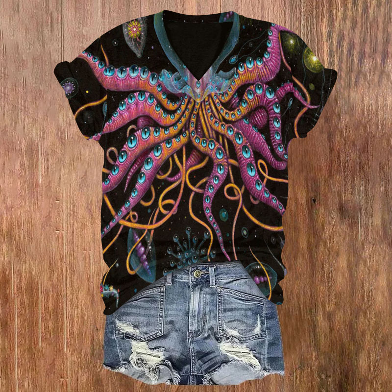 Dashingsoul Octopus Asymmetric Print V-neck T-shirt