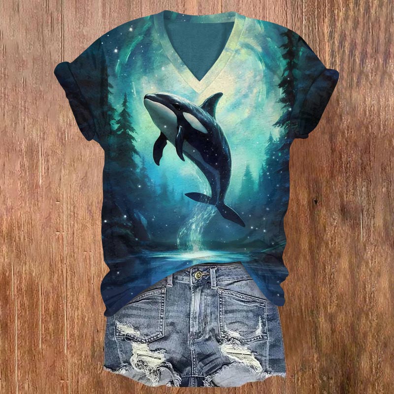 Dashingsoul Fantasy Aurora Forest Killer Whale Print V-neck T-shirt