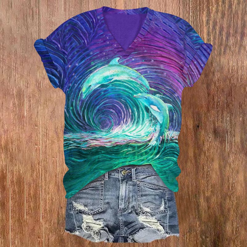 Dashingsoul Fantasy Aurora Dolphin Line Art Print V-neck T-shirt