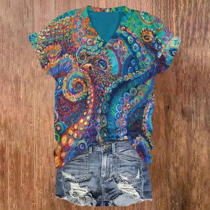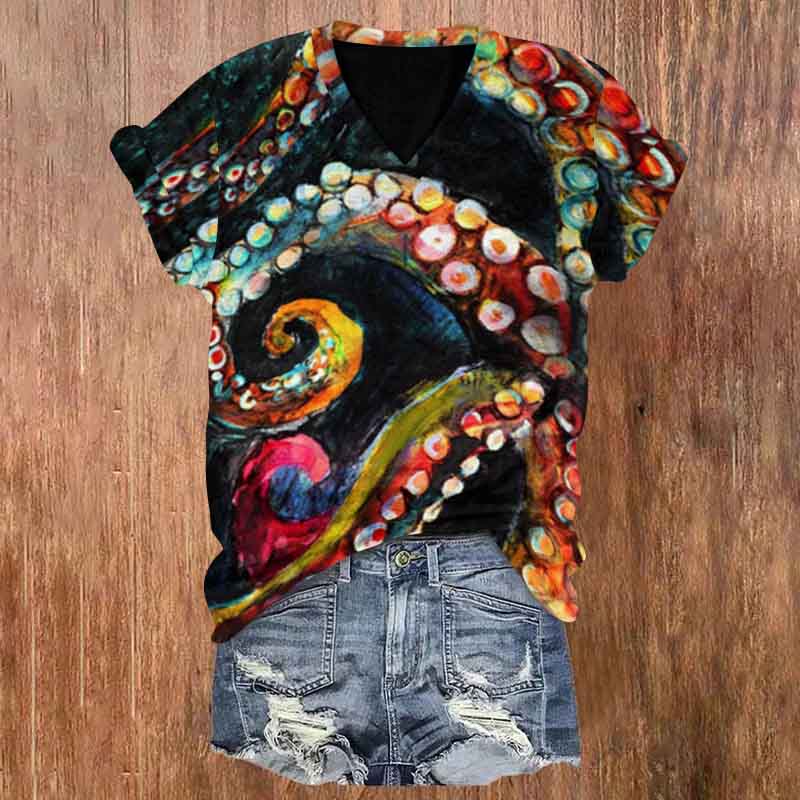 Dashingsoul Multicolor Octopus Oil Painting Art Printed Print V-neck T-shirt
