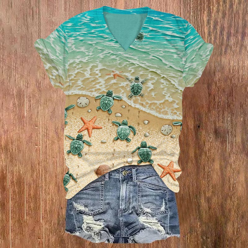 Dashingsoul Turtle Sea Print V-neck T-shirt
