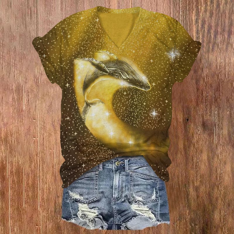 Dashingsoul Starry Whale In Golden Space Print V-neck T-shirt
