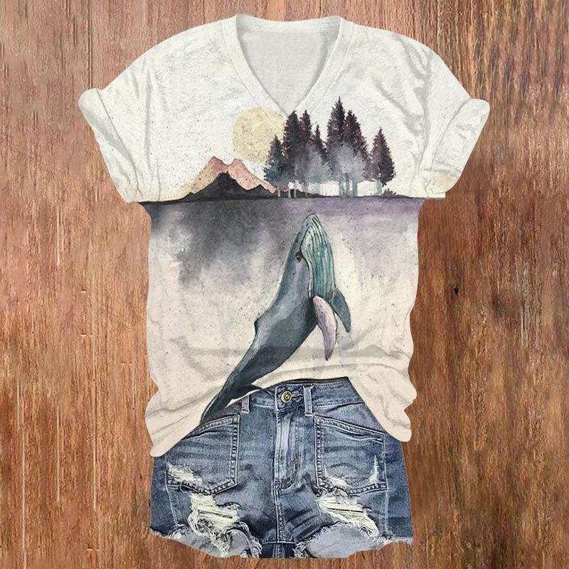 Dashingsoul Watercolor Forest Whale Print V-neck T-shirt
