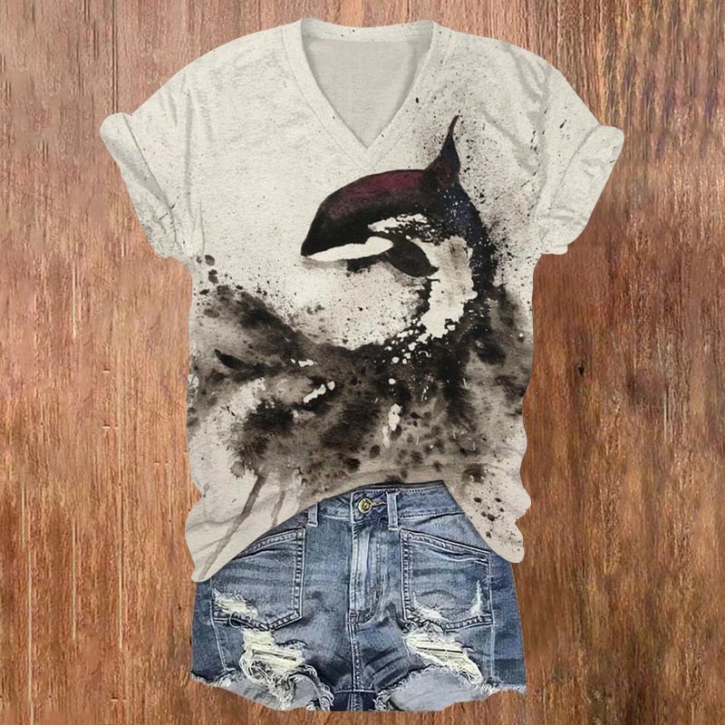 Dashingsoul Watercolor Killer Whales Print V-neck T-shirt