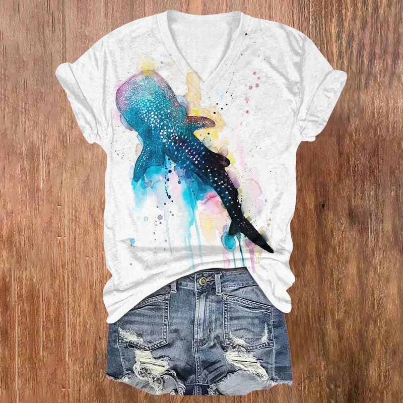 Dashingsoul Watercolor Sfumato Whale Shark Print V-neck T-shirt