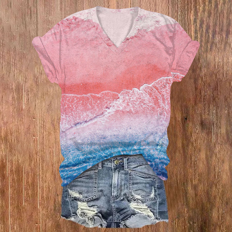 Dashingsoul Women's Pink Beach Wave Ombre Art Print Casual V-neck T-shirt