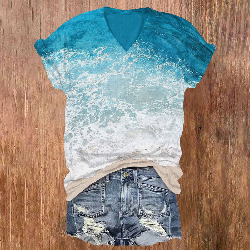Dashingsoul Women's Wave Ombre Art Print Casual V-neck T-shirt