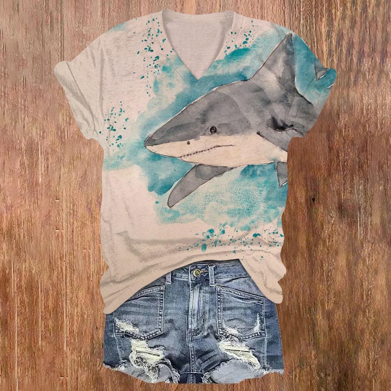 Dashingsoul Shark Watercolor Print V-neck Short Sleeves T-shirt