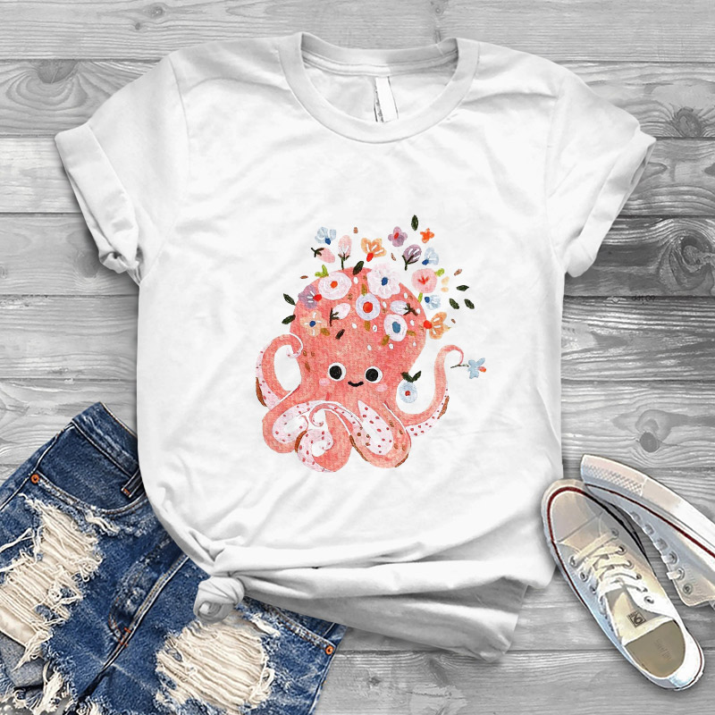 Dashingsoul Casual Cute Cartoon Floral Octopus Print T-shirt
