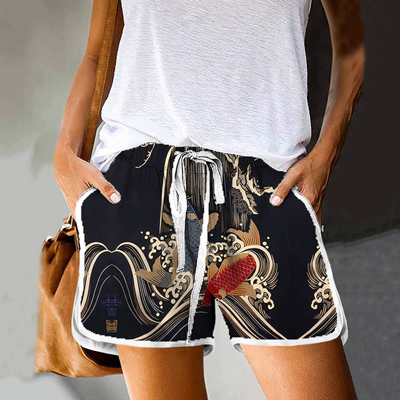 Dashingsoul Japanese Style Koi Fish Dragonfly Wave Art Print Drawstring Pocket Shorts
