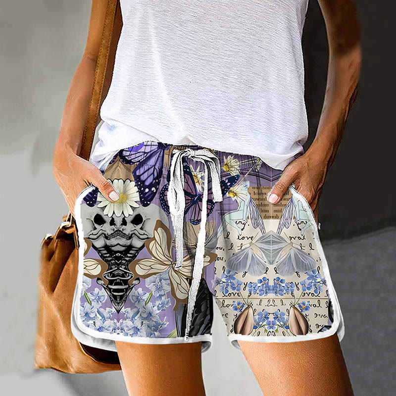 Dashingsoul Women's Colorful Butterfly Collecting Nectar Print Drawstring Pocket Shorts