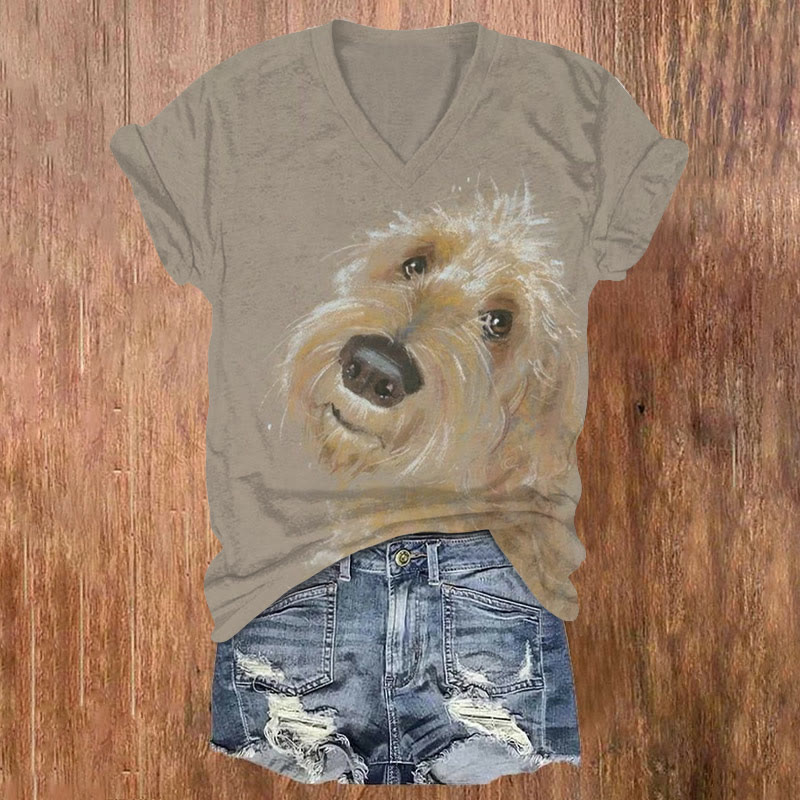 Dashingsoul Casual Oil Painting Puppy Print V-neck T-shirt