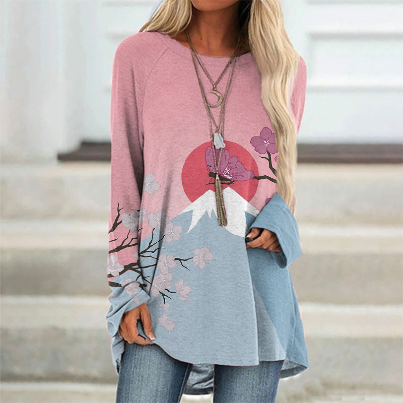 Dashingsoul Pastel Cherry Blossoms Mount Fuji Print Long Sleeve Tunic
