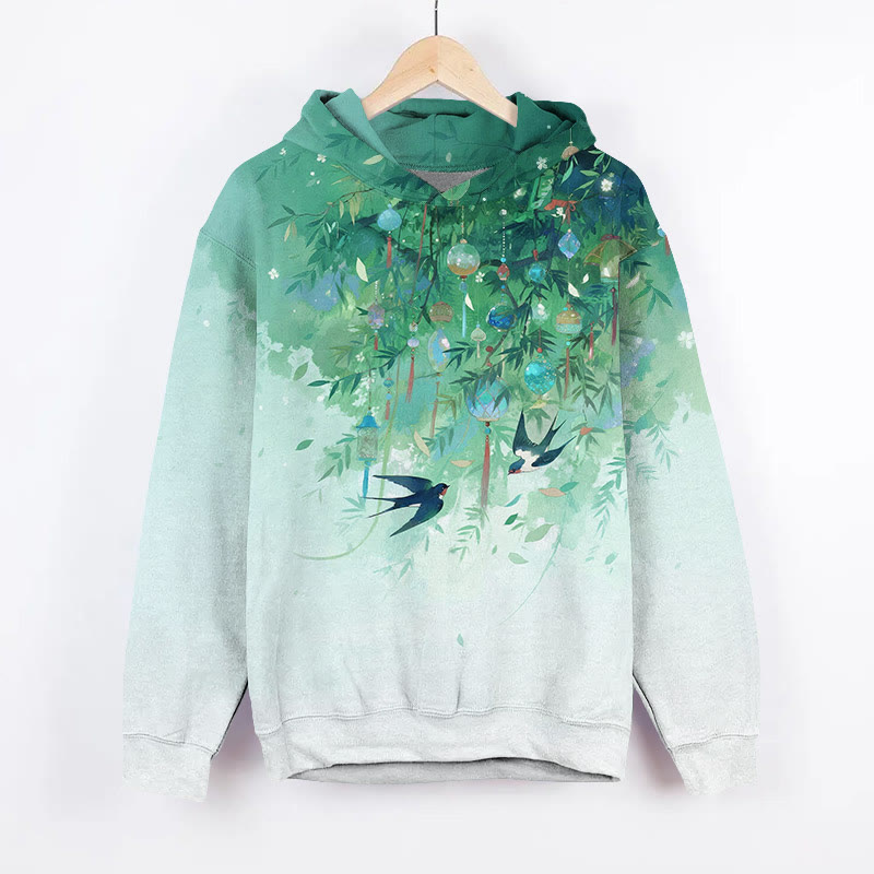 Vintage Watercolor Willow & Swallow Art Print Long Sleeve Hoodie