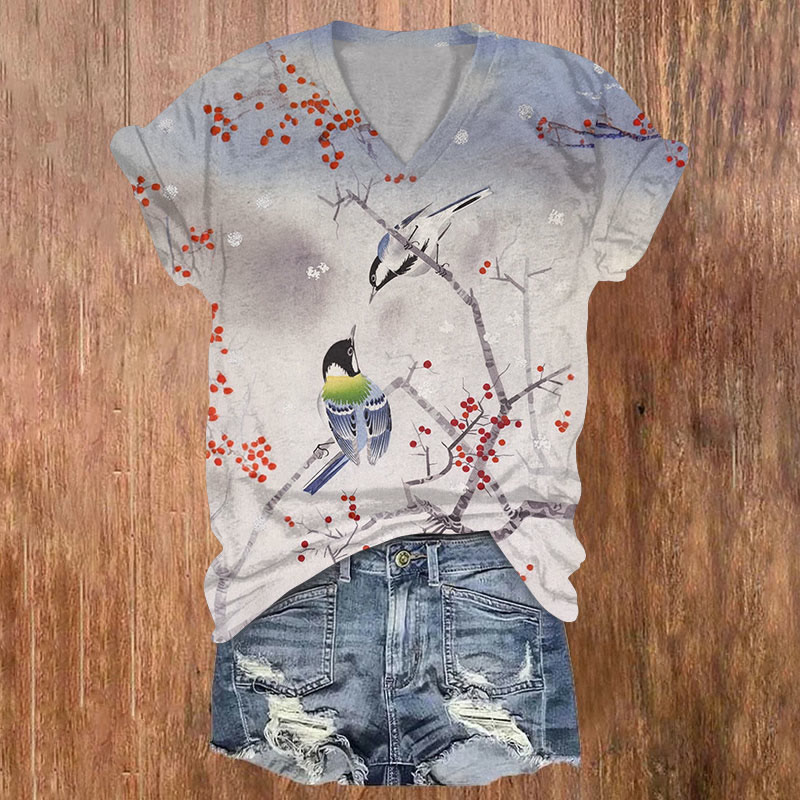 Vintage Couple Birds & Blossom Print Short Sleeved V-neck T-shirt