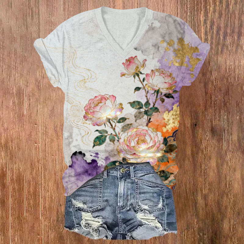 Retro Floral Print Short Sleeved V-Neck T-Shirt