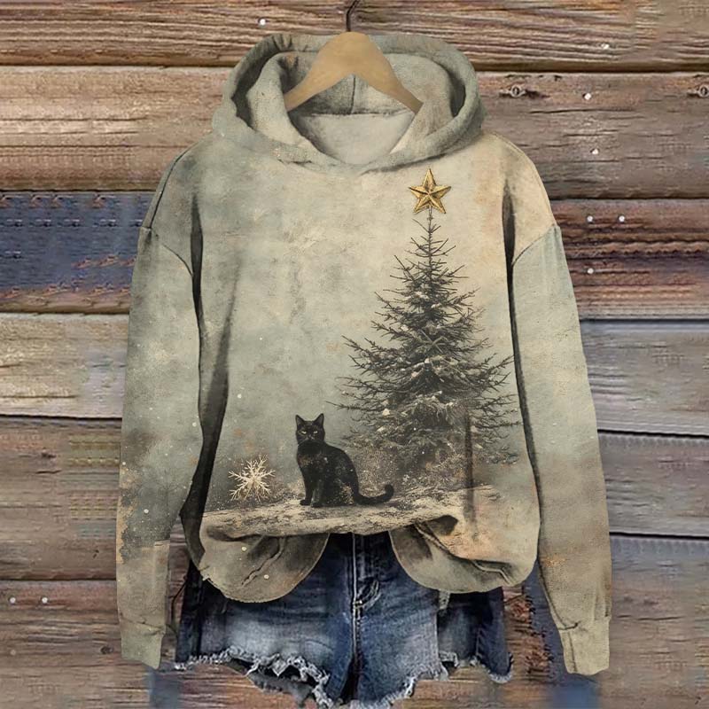 Vintage Ink Watercolor Christmas Tree & Black Cat Art Print Long Sleeve Hoodie