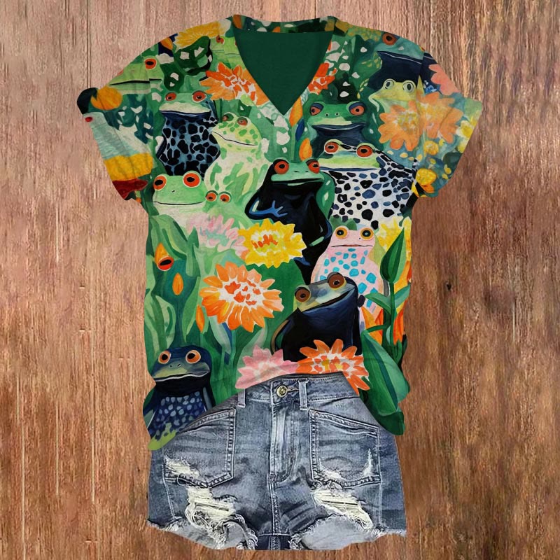 An Endearingly Silly, Fun-loving Frog Printed Short Sleeved V-neck T-shirt