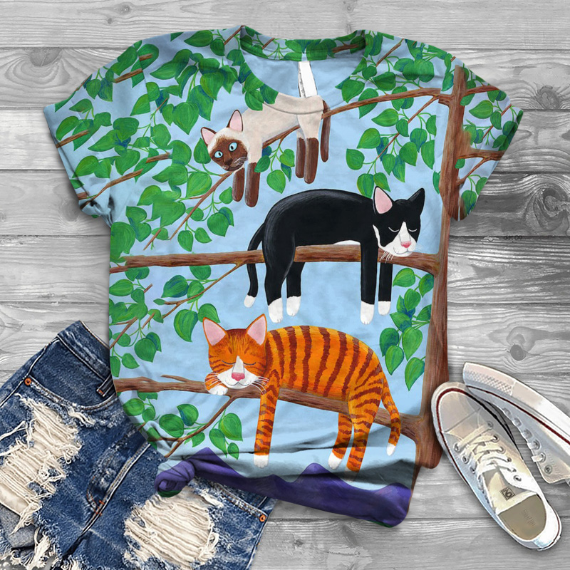 Dashingsoul Funny Lazy Cat Sleeping On Tree Oil Painting Art Print Short Sleeve T-shirt