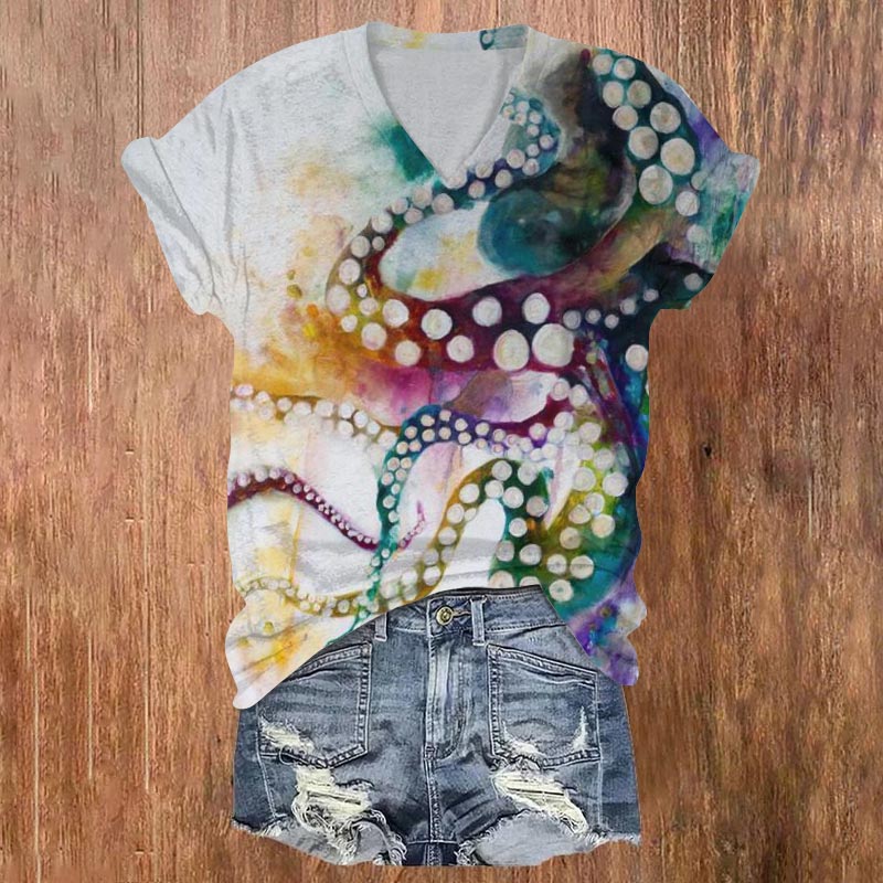 Dashingsoul Watercolor Ombre Octopus Print V-neck T-shirt