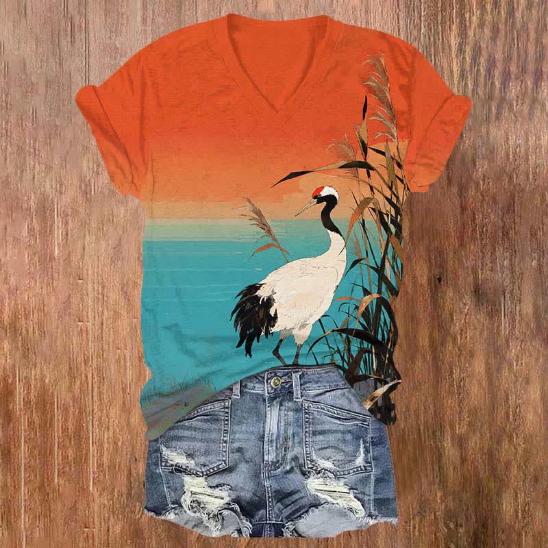 Japanese Vintage Color Block Crane Art Print V-neck T-shirt