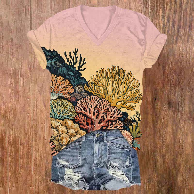 Vintage Ocean Watercolor Coral Art Print V-neck T-shirt