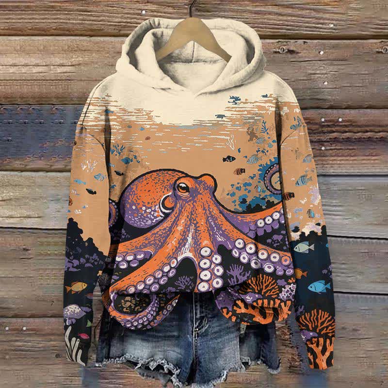 Vintage Watercolor Underwater Octopus Art Print Long Sleeve Hoodie