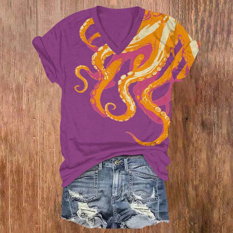 Japanese Vintage Vivid Octopus Art Print V-neck T-shirt