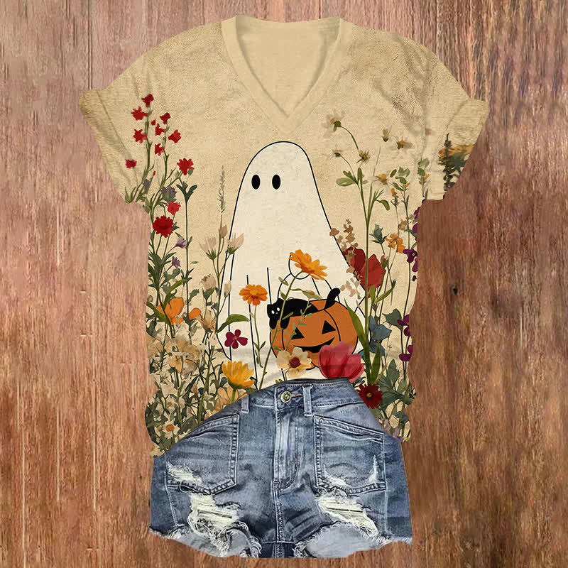 Halloween Ghost & Pumpkin Surrounded By Flowers Print V-neck T-shirt