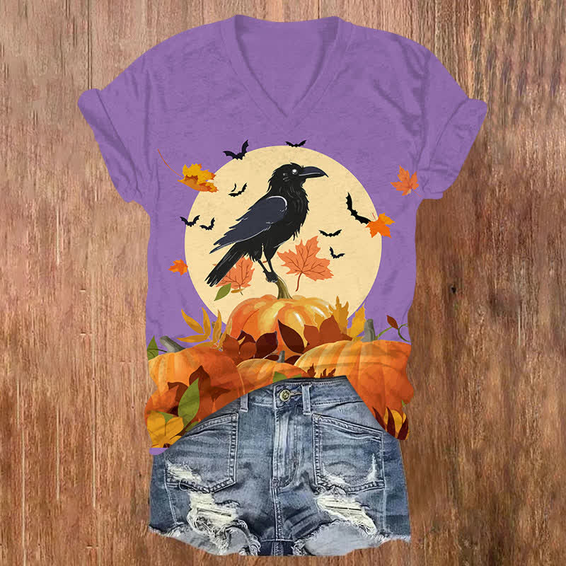 Halloween Crow Standing On Pumpkin Bush & Maple Leaves Print V-neck T-shirt