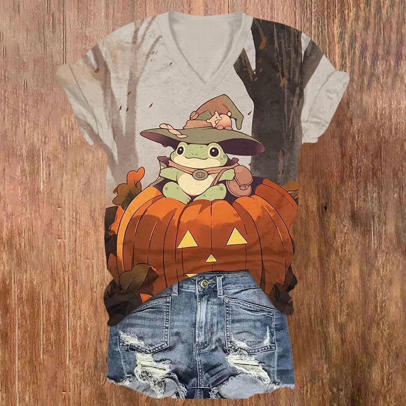Halloween Lovely Frog Sitting In Pumpkin Art Print V-neck T-shirt