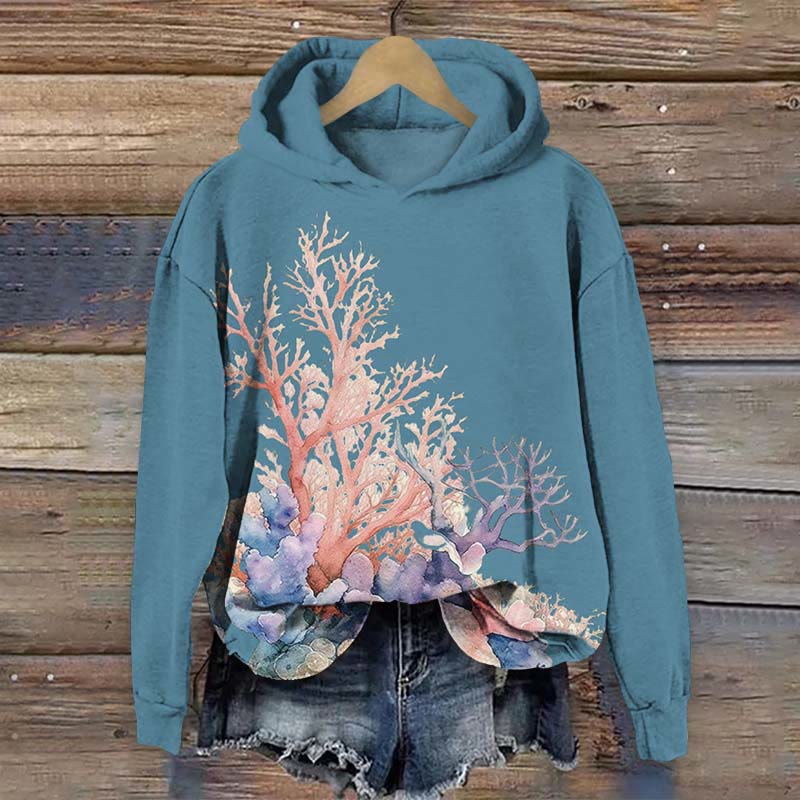 Vintage Ocean Colored Coral Print Long Sleeve Hoodie