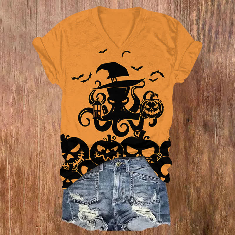 Halloween Creative Octopus Holding Jack-o'-lantern Art Print V-neck T-shirt