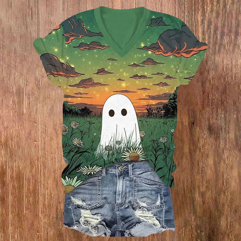 Halloween Sunset Ghost Among The Chrysanthemum Art Print V-neck T-shirt