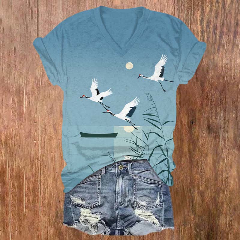 Japanese Vintage Solid Color Crane Pattern Print V-neck T-shirt