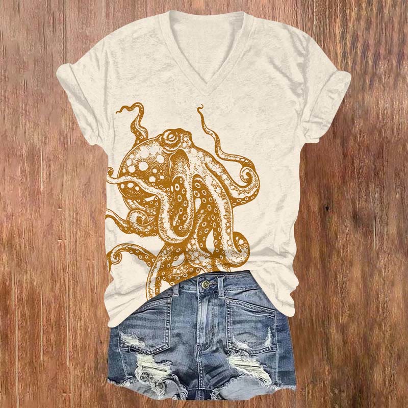 Vintage Sea Surface Bisection Whale Print V-neck T-shirt