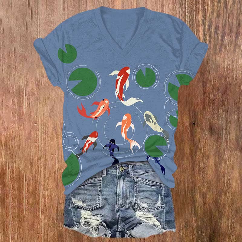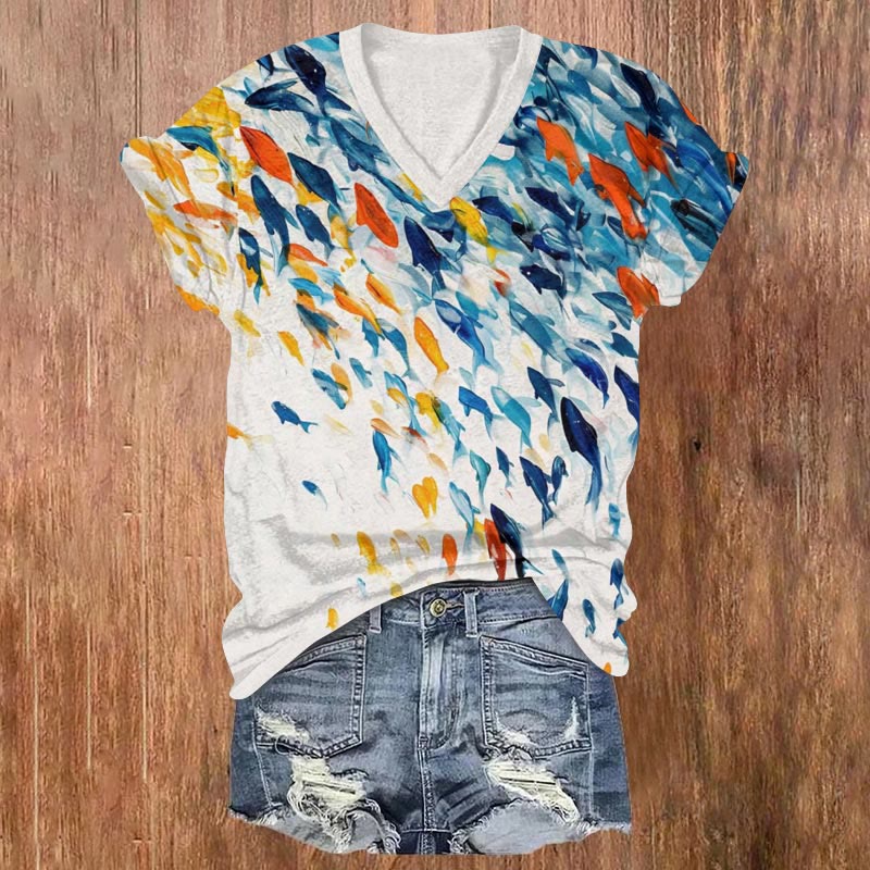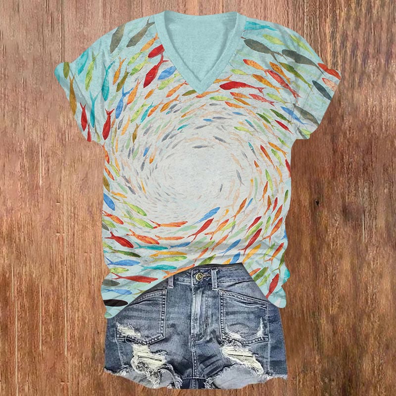 Japanese Watercolor Ocean Fish Print V-neck T-shirt