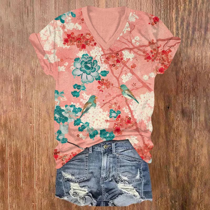Japanese Vintage Loving Birds On The Tree Print V-neck T-shirt