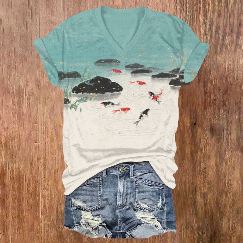 Vintage Ink Watercolor Goldfish In The River Print V-neck T-shirt