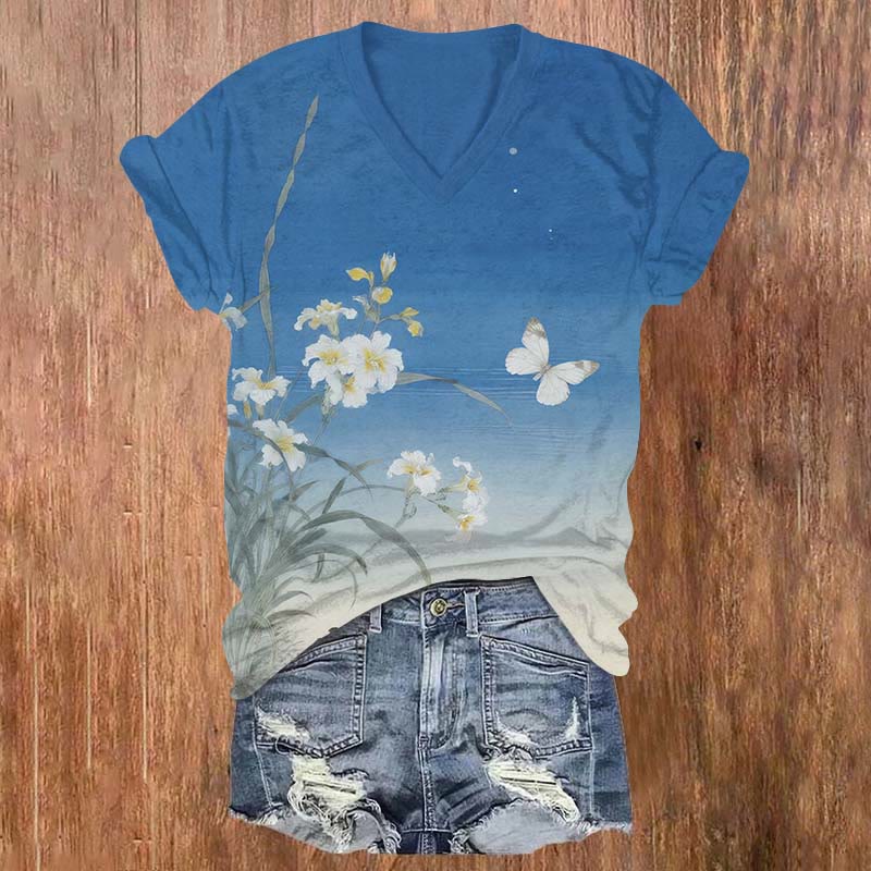 Vintage Watercolor Floral & Butterfly Under Blue Sky Print V-neck T-shirt