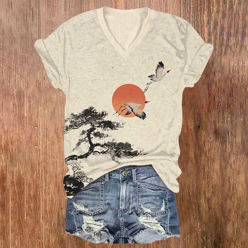 Japanese Crane Flying Around Red Sun & Cloud Pattern Print V-neck T-shirt