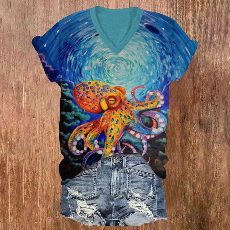 Oil Painting Colorful Octopus Art Print V-neck T-shirt