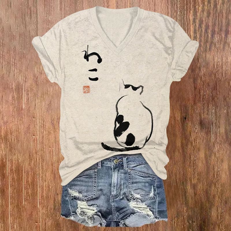 Japanese Minimalist Cat Art Vintage Print V-neck T-shirt