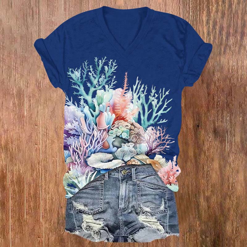 Vintage Ocean Colorful Coral Art Print V-neck T-shirt
