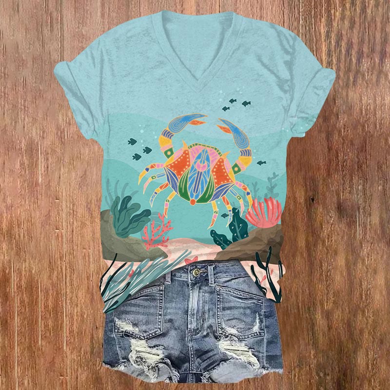 Creative Fantasy Colorful Crab Print V-neck T-shirt
